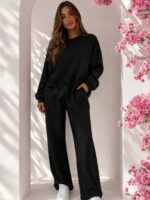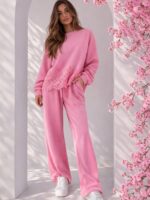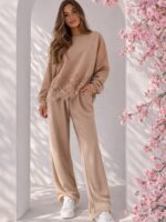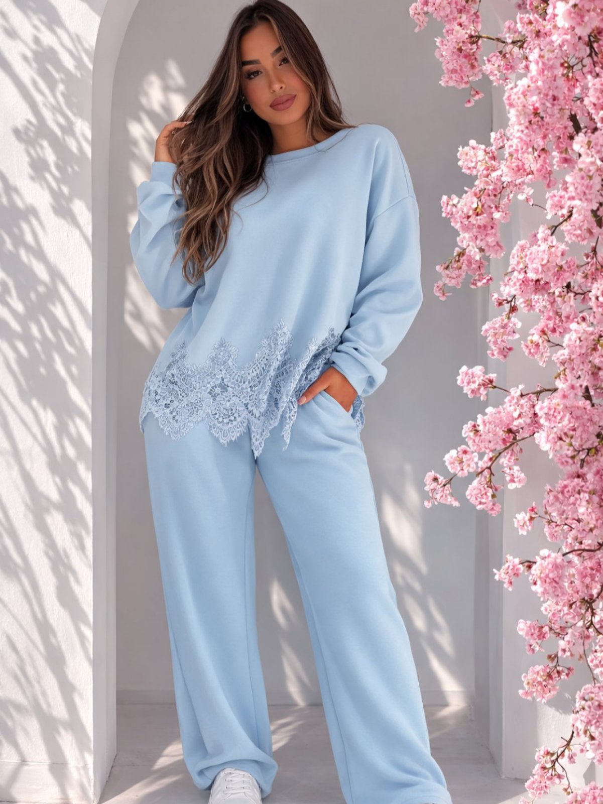 Комплет тренерки со блуза со долги ракави и округлест изрез со тантела на ракавите и тантела во долниот дел. Панталони со висок струк и ластик на половината за полесно прилагодување и два странични џебови.
