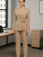 Дводелен еднобоен костум со сако и панталони. Панталоните се со широки ногавици и ластик на половина за полесно прилагодување. Сакото е со голема ревер јака и на преклоп со странично врзување и голем брош на предната страна.
