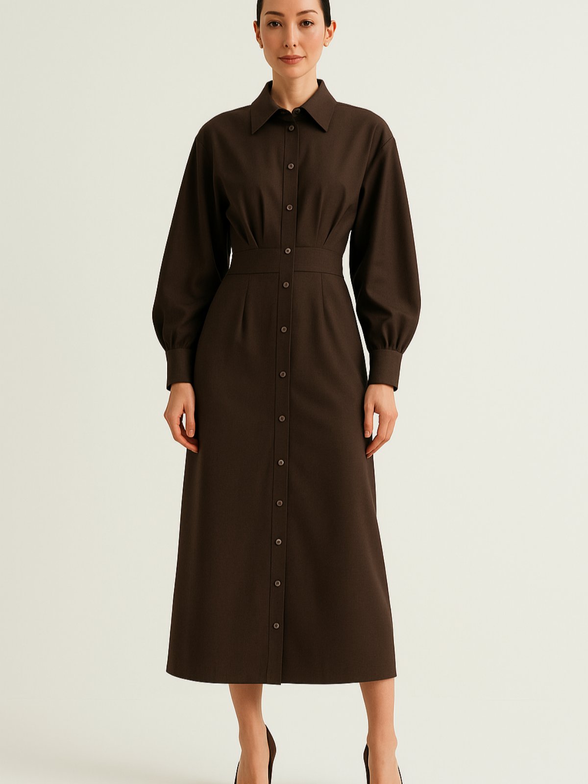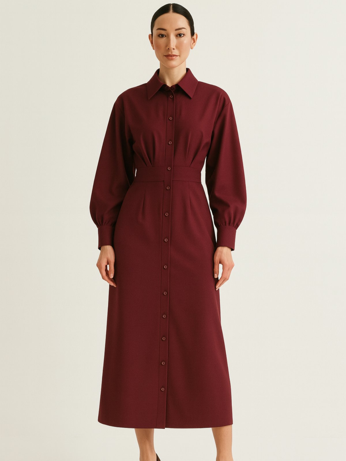 Миди еднобоен фустан од подебела непровидна ткаенина со копчиња на предниот дел по целата должина на фустанот. Ревер јаки и раглан ракави кои завршуваат со потесен дел. Колан од двете страни на половината со кој се врзува назад фустанот.