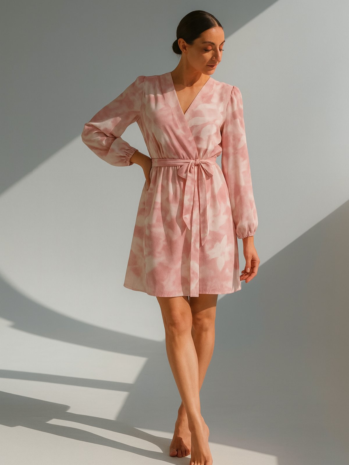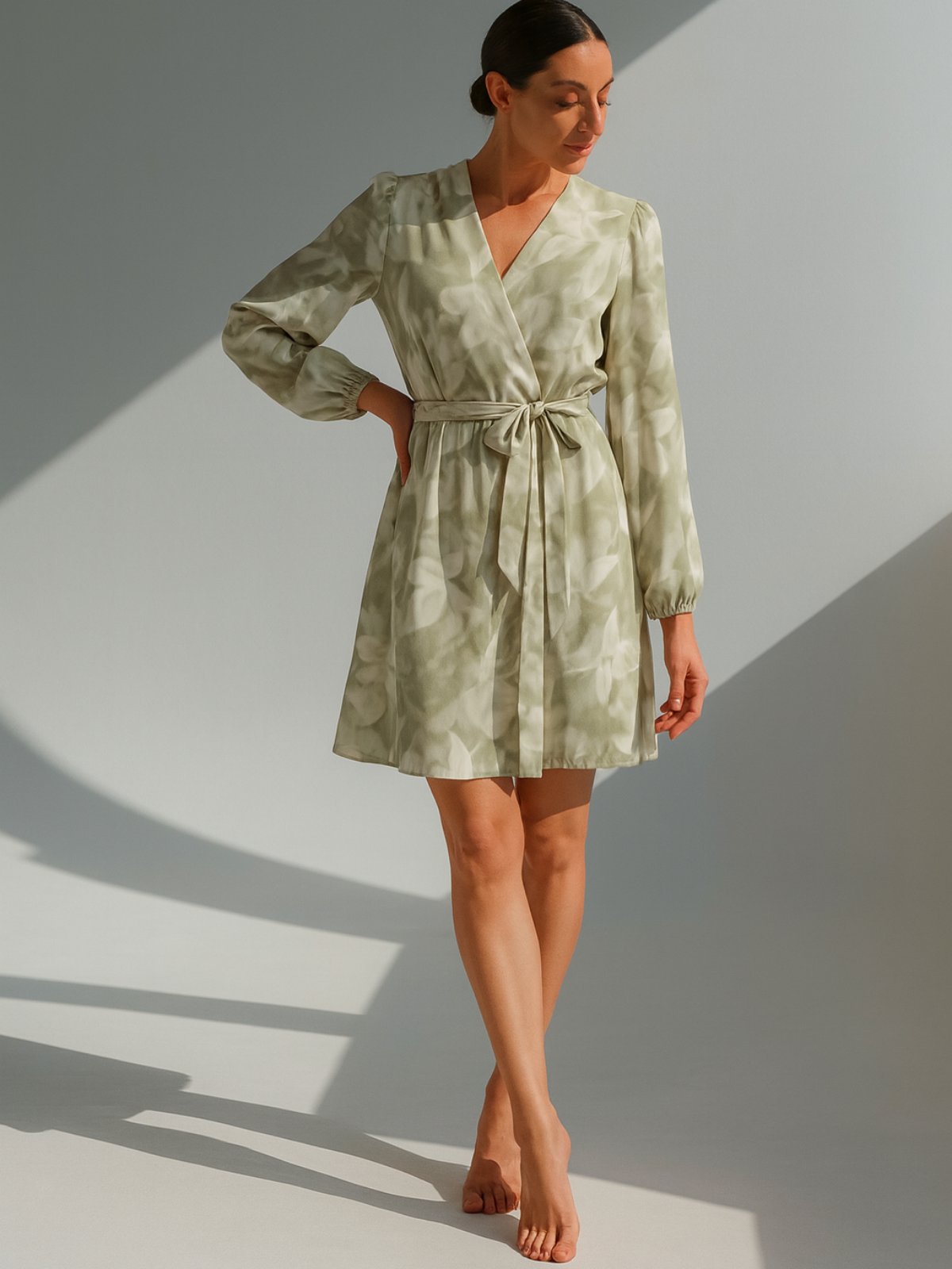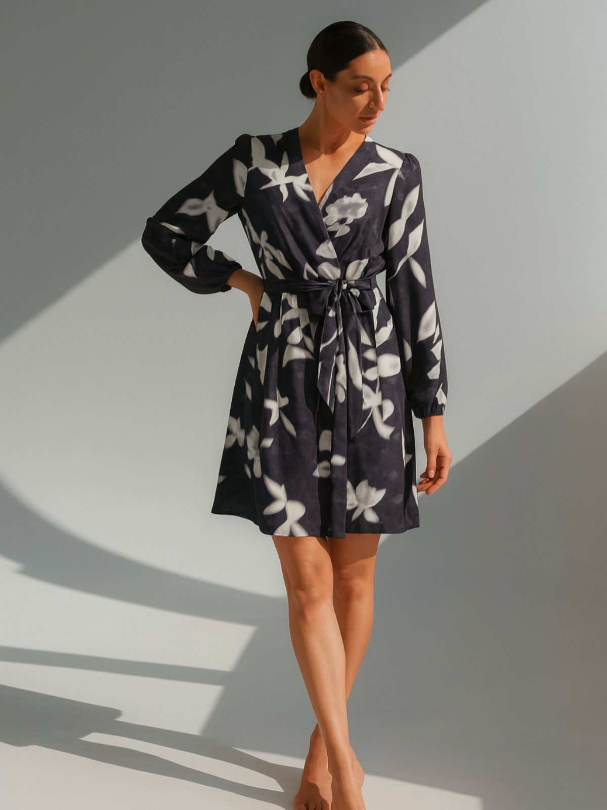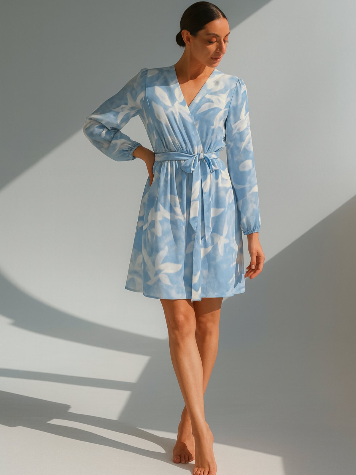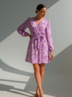 Фустан од лелеава ткаенина со бели цветови и ластик на половина за полесно прилагодување и колан од истата тркаенина како фустанот. Долги ракави кои завршуваат со ластик и V изрез.