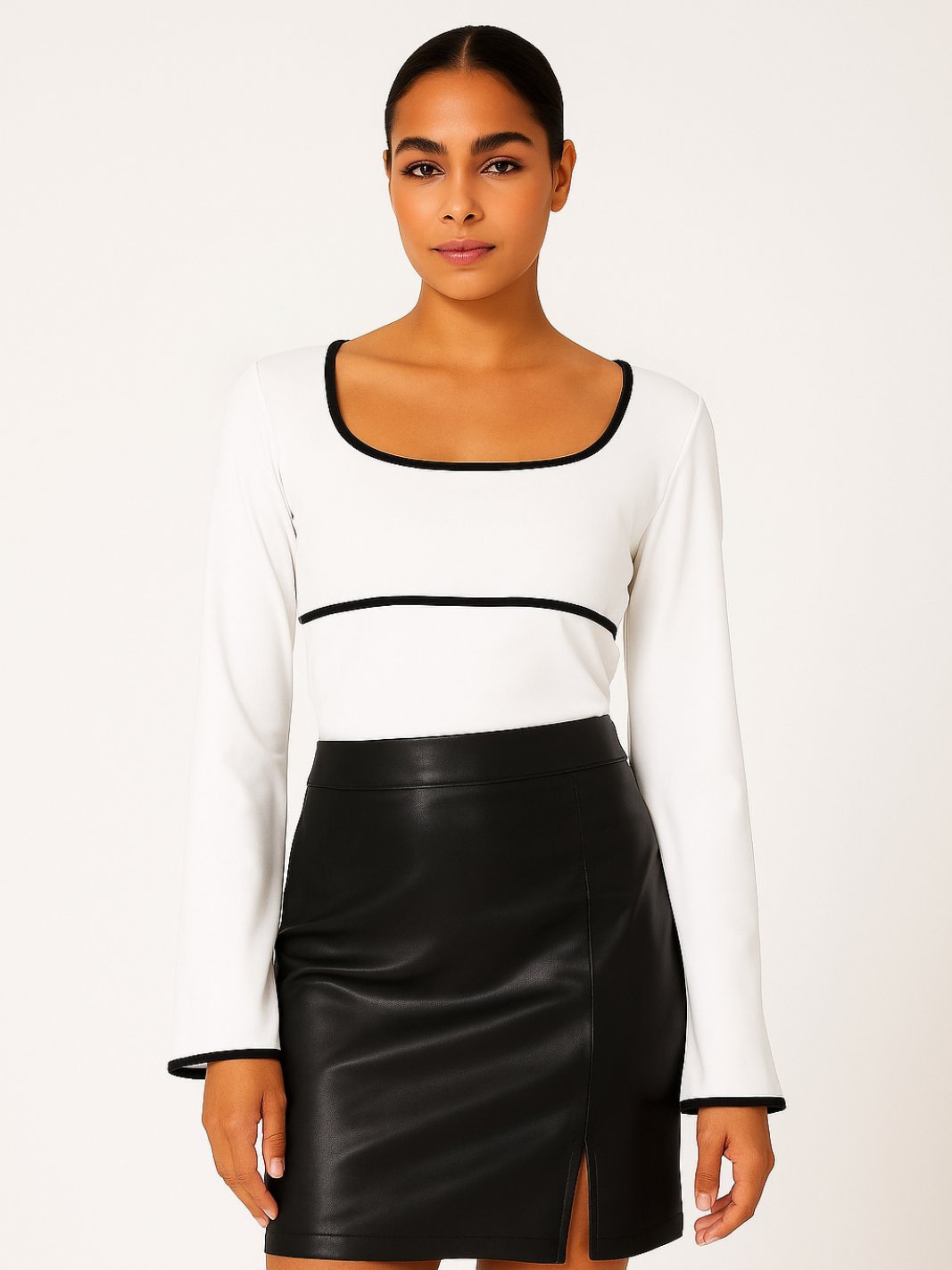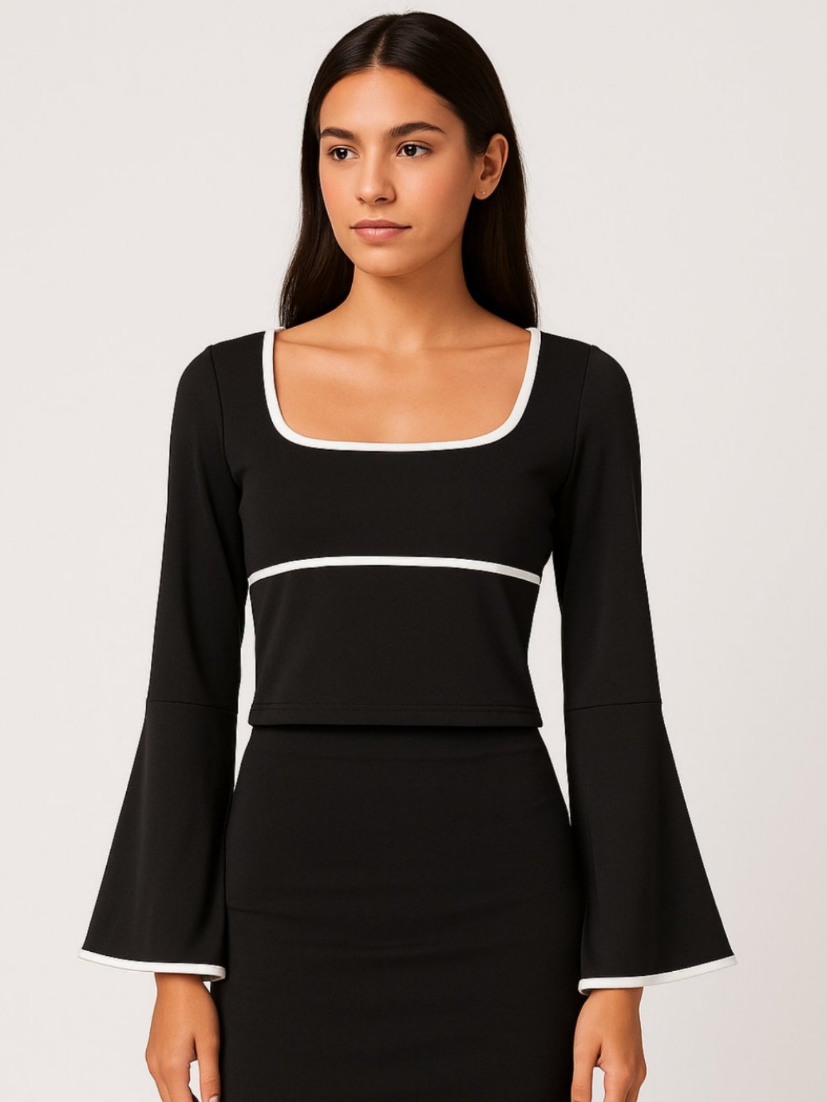 Еднобојна блуза од мокра ликра со траки бела или црна во зависност од основата на блузата. Изрез во форма на правоаголник и долги ѕвонести ракави.