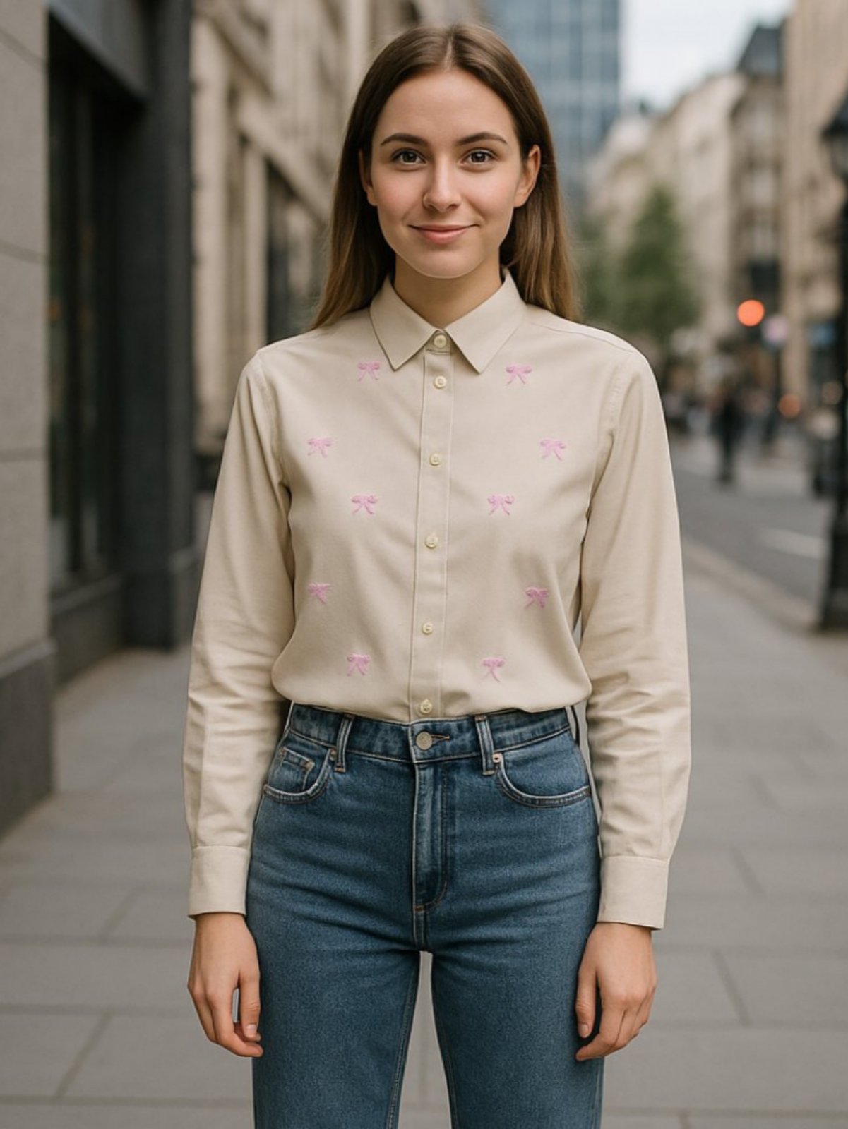 Еднобојна кошула со розови панделки на предниот дел. Ревер јака, долги ракави и предно закопчување со копчиња.