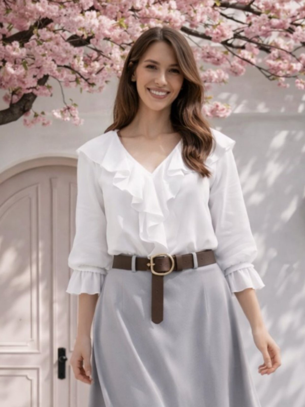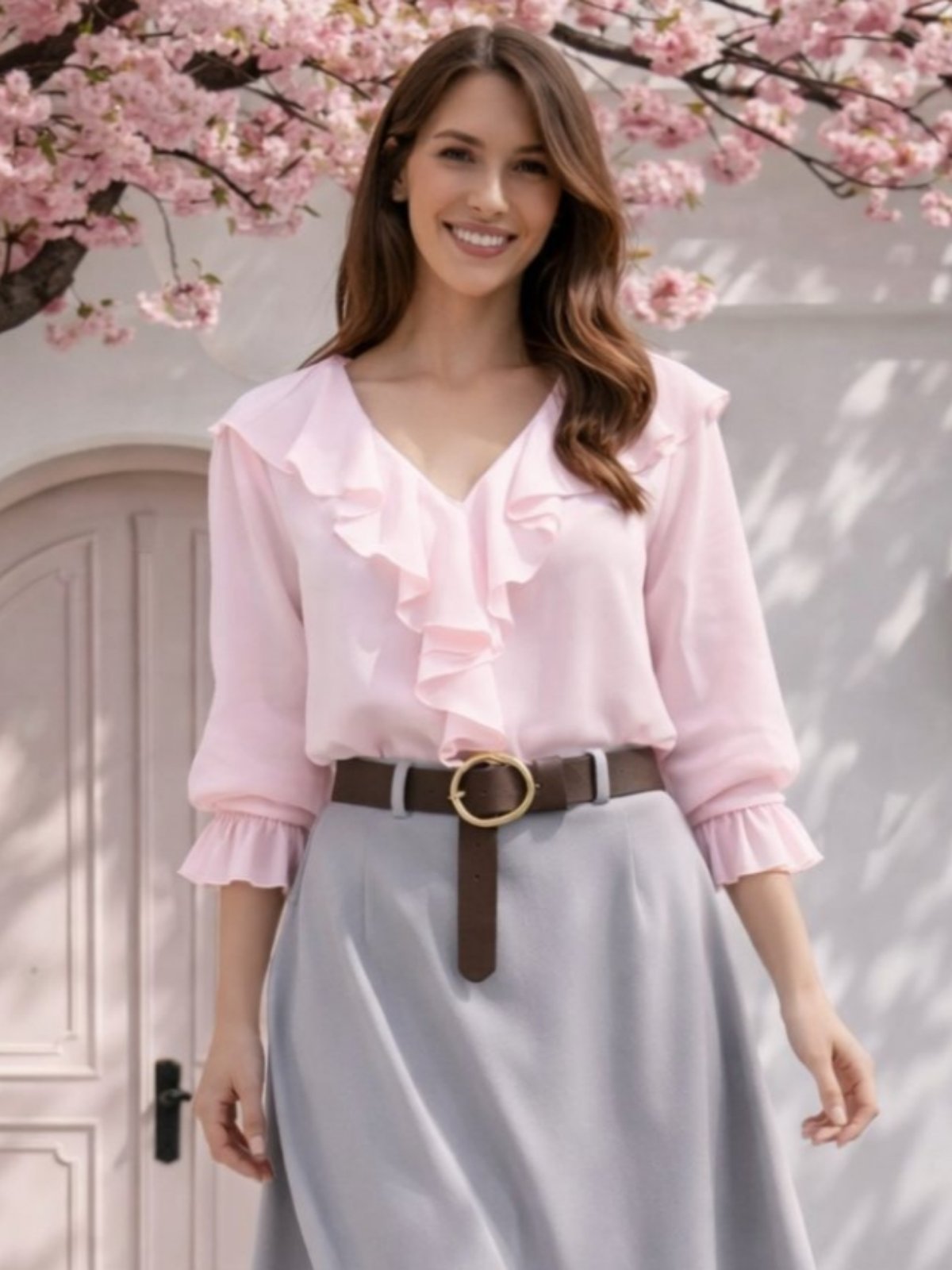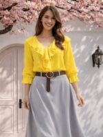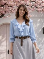 Еднобојна кошула од лелеава и непровидна ткаенина со долги ракави и V изрез кој надолу продолжува со фарбела на предниот дел.