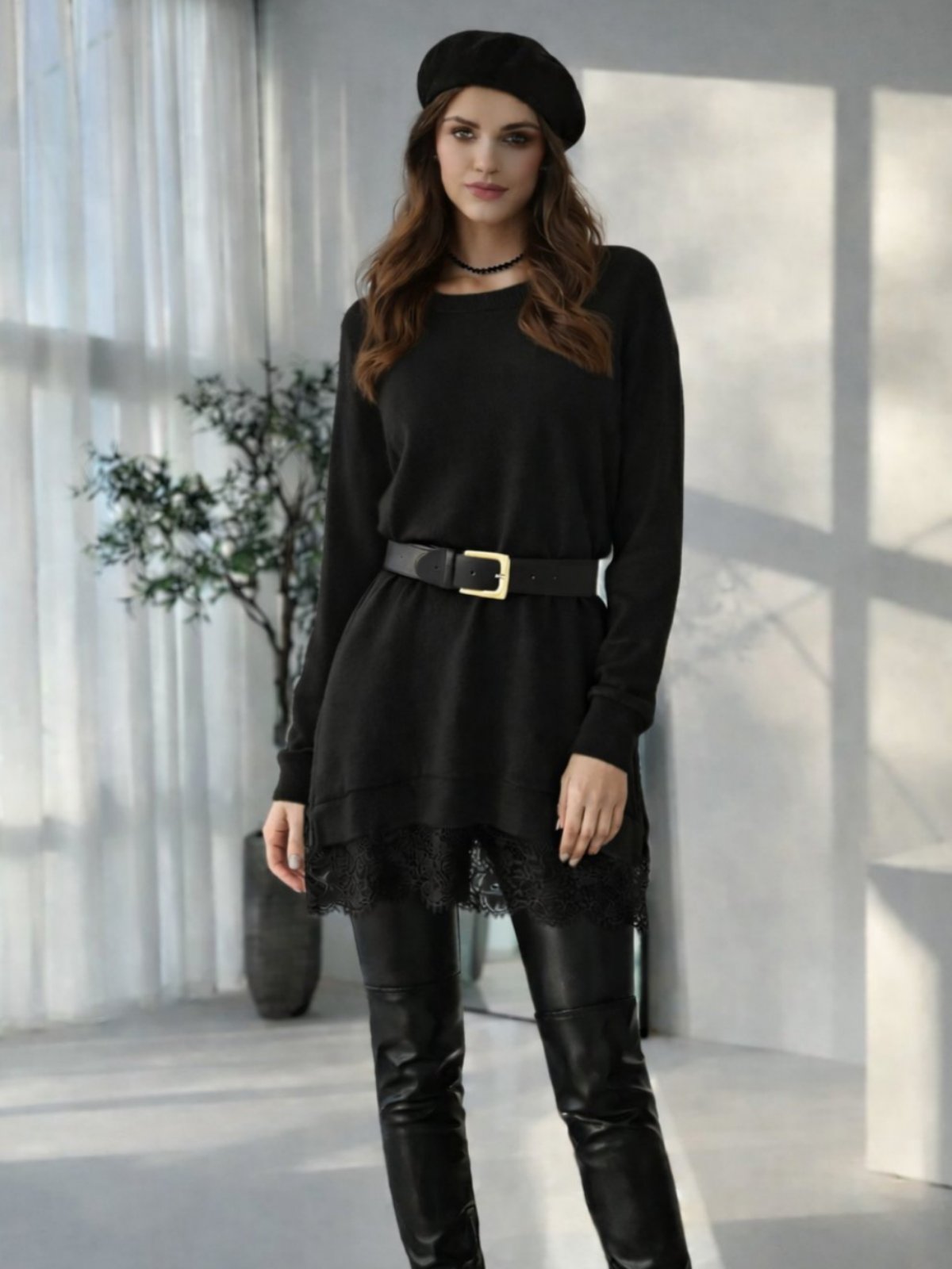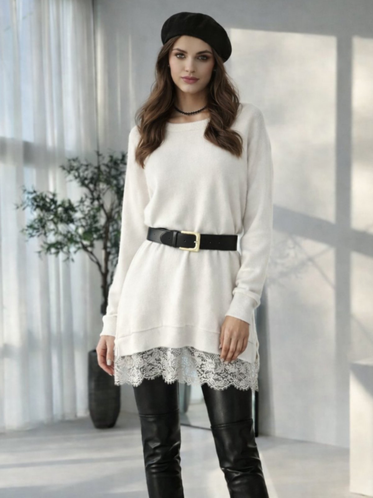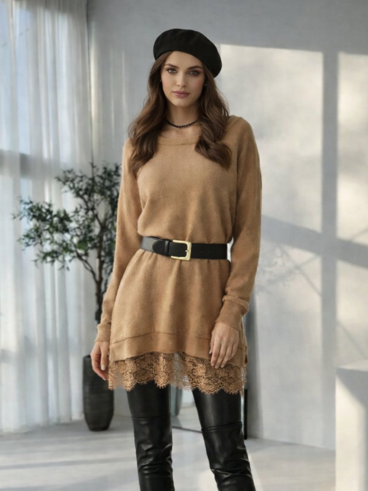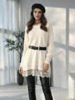 Долга туника од мека и непровидна ткаенина со округлест изрез и долги ракави која во долниот дел завршува со тантела. Може да одговара и како блуза за поголеми броеви.
