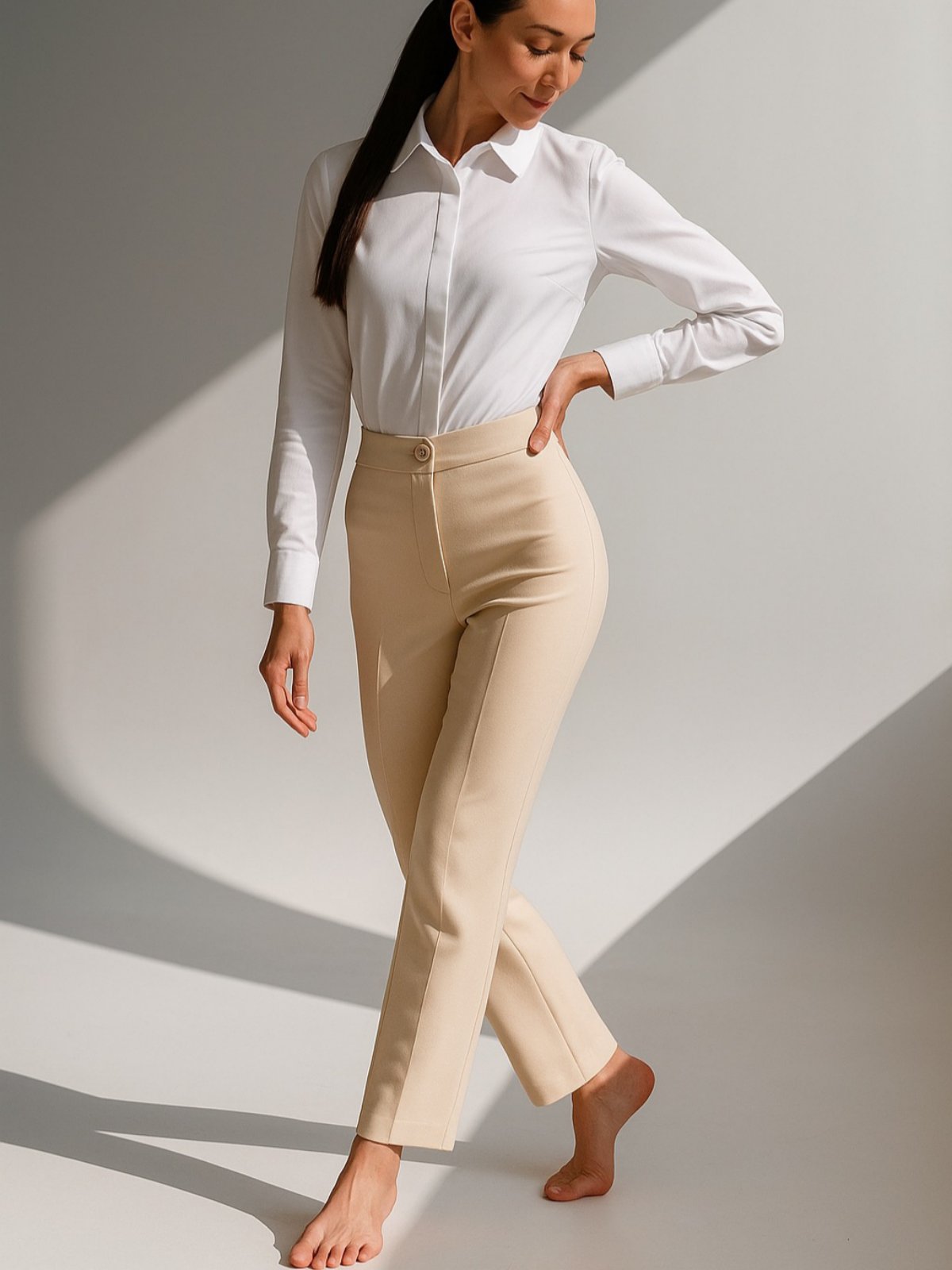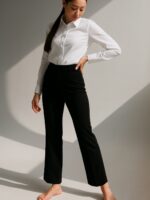 Панталони со висок струк и прави ногавици со раб на предниот дел. Предно закопчување со патент и копче.
