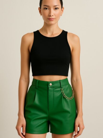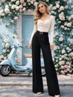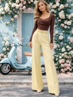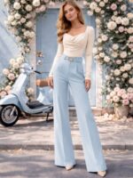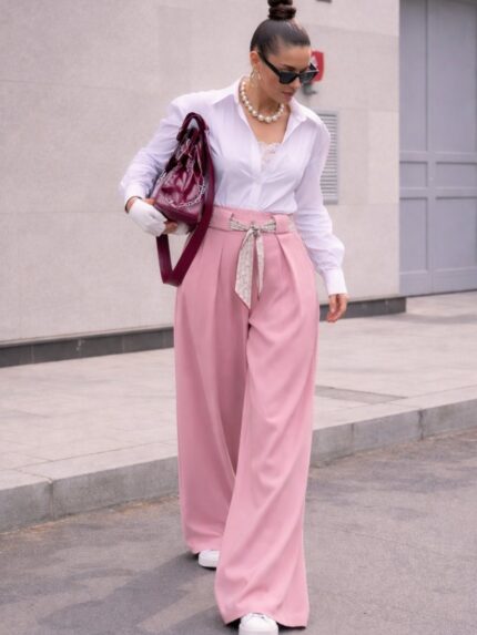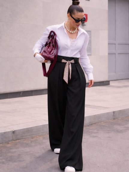 Еднобојни панталони со широки ногавици и виоск струк. Два предни странични џебови и предно закопчување со патент и копче. Колан од вештачка кожа во иста боја како панталоните.