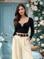 Еднобојно боди од непровидна ткаенина која стега и совршено обликува со долно закопчување со долги ракави со изрез во форма на правоаголник и златна тока помеѓу градите.