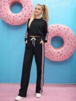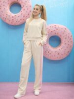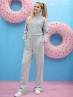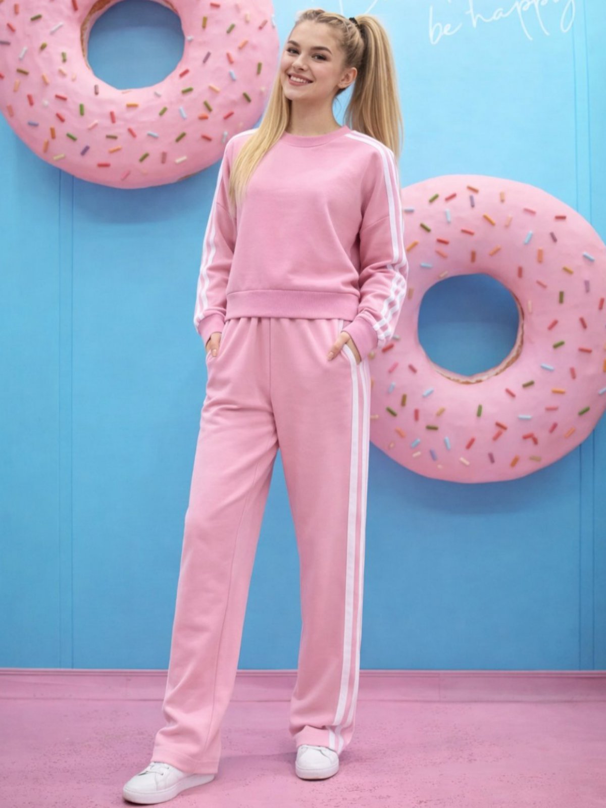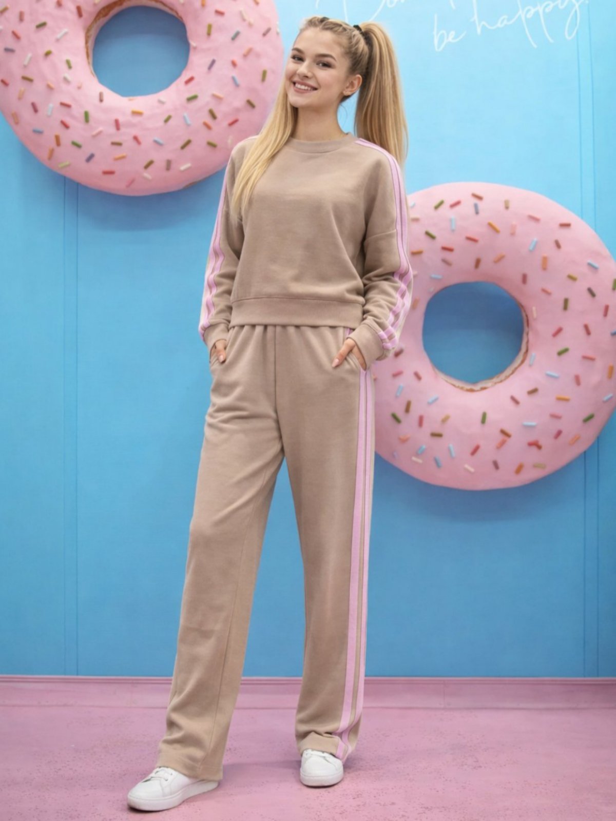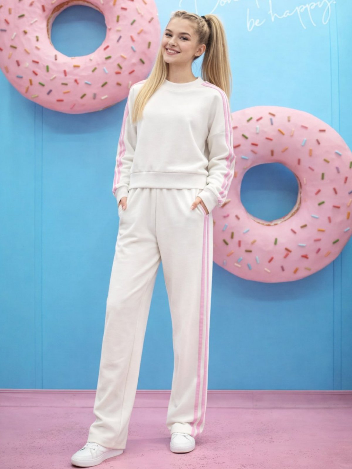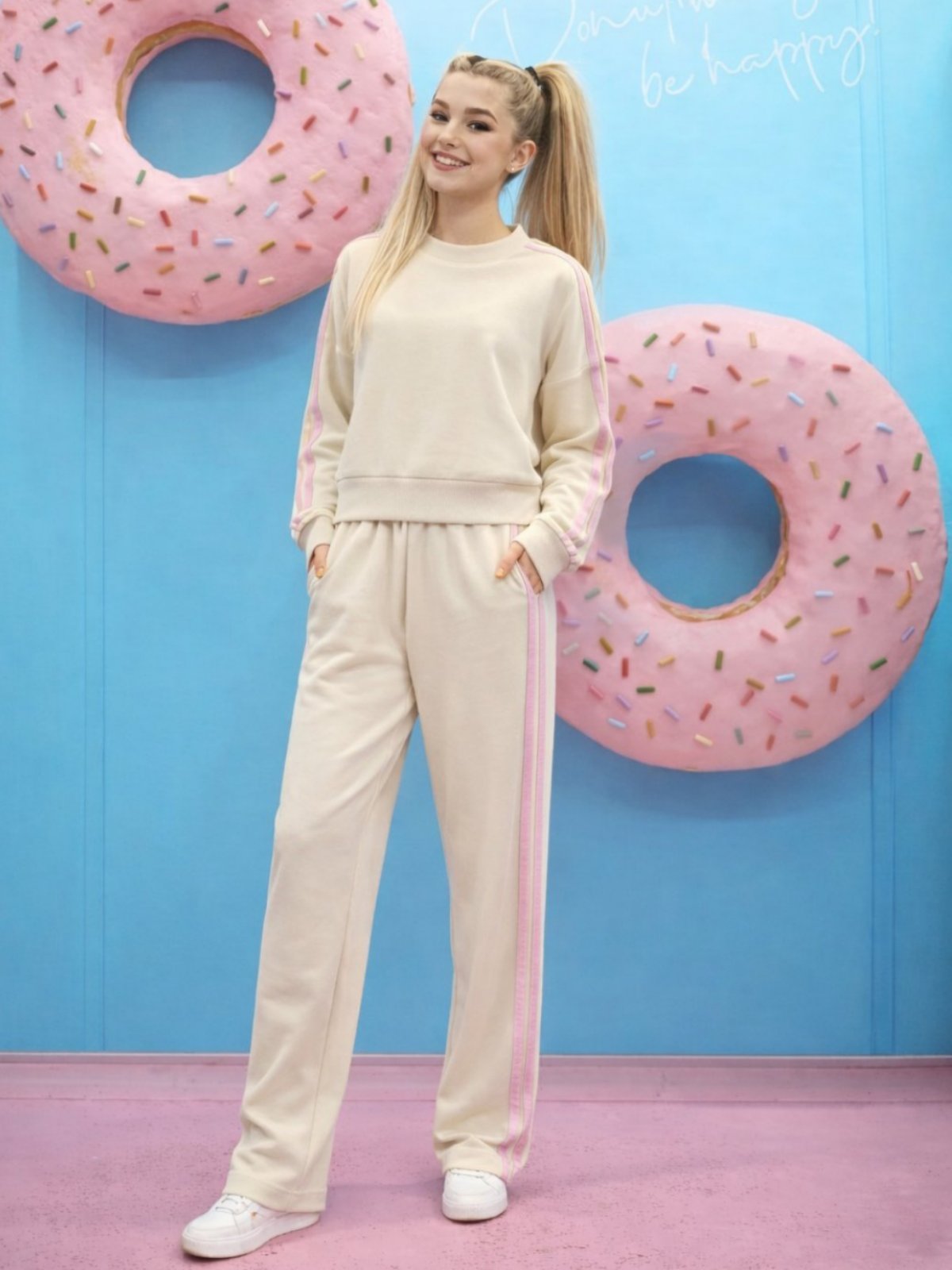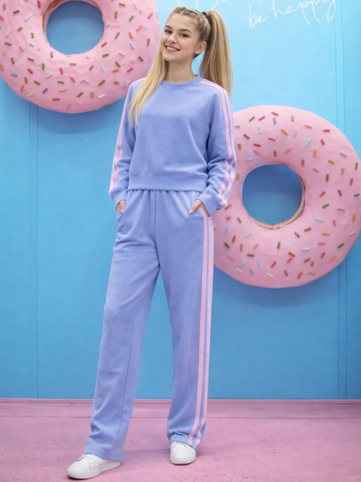 Комплет памучни тренерки со долен дел со висок струк, ластик на половина за полесно прилагодување и широки ногавици и странични треки во боја. кретка блуза со долги ракави и округлест изрез со странични траки на ракавите.