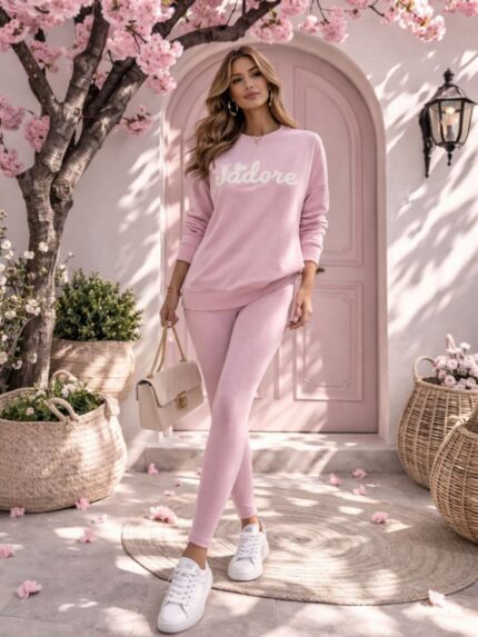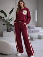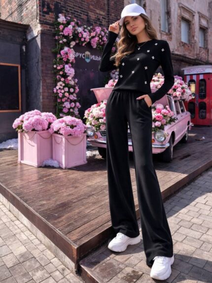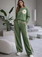 Комплет тренерки од мека и пријатна ткаенина со блуза со округлест изрез и долги ракави декорирана со цвет од едната страна. Панталони со висок струк, широки ногавици со траки од двете страни и ластик на половината за полесно прилагодување.