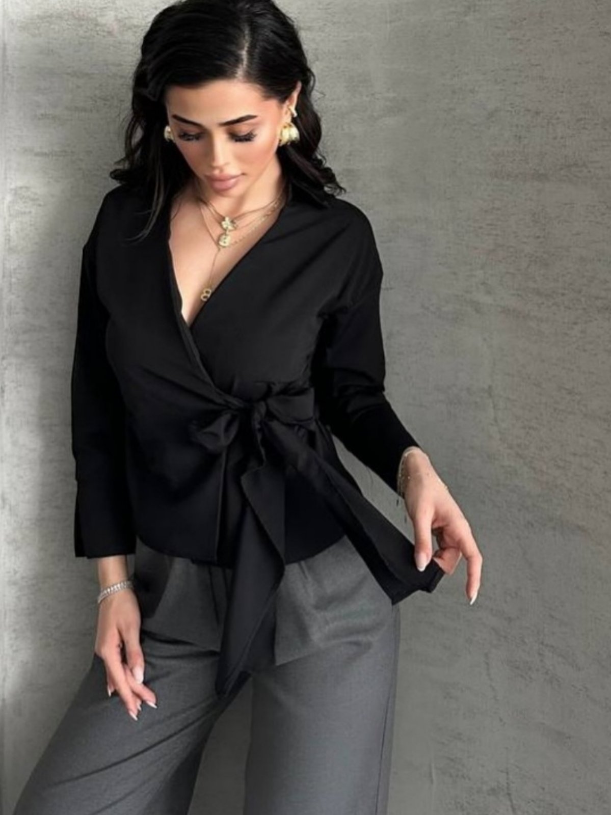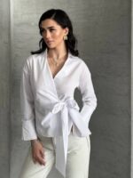 Еднобојна кошула на преклоп со V изрез и странични појаси кои се врзуваат во панделка на предниот дел.