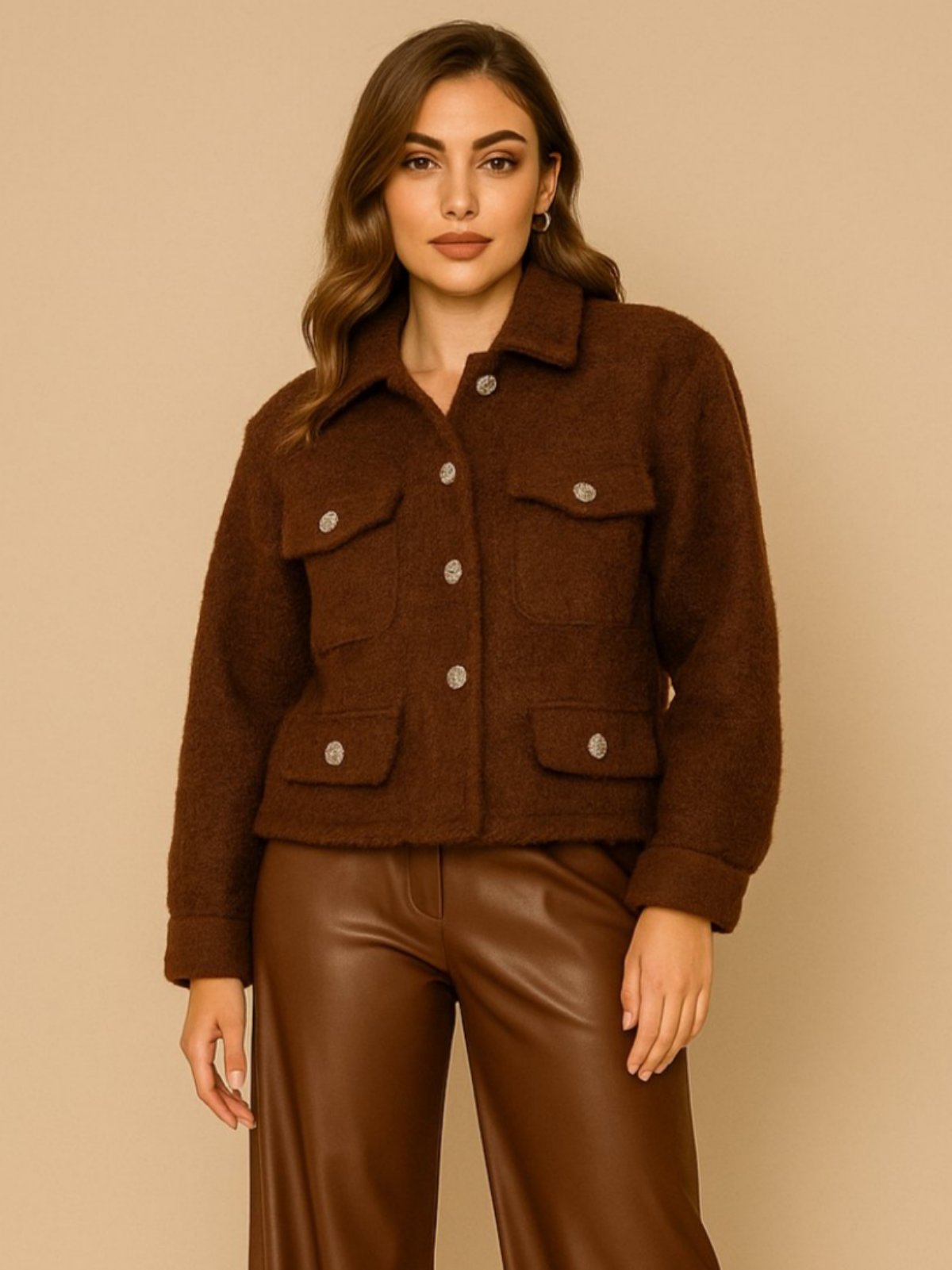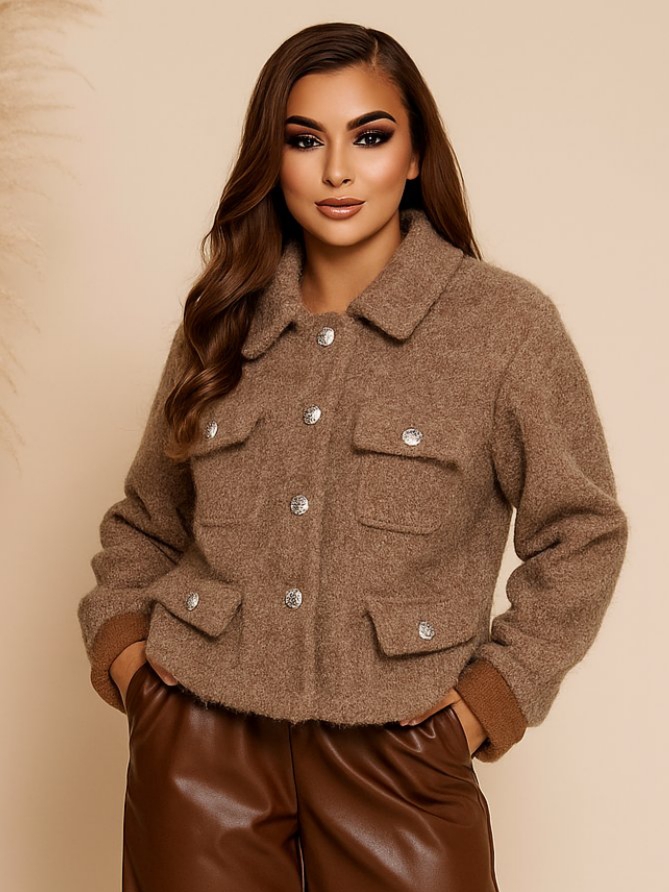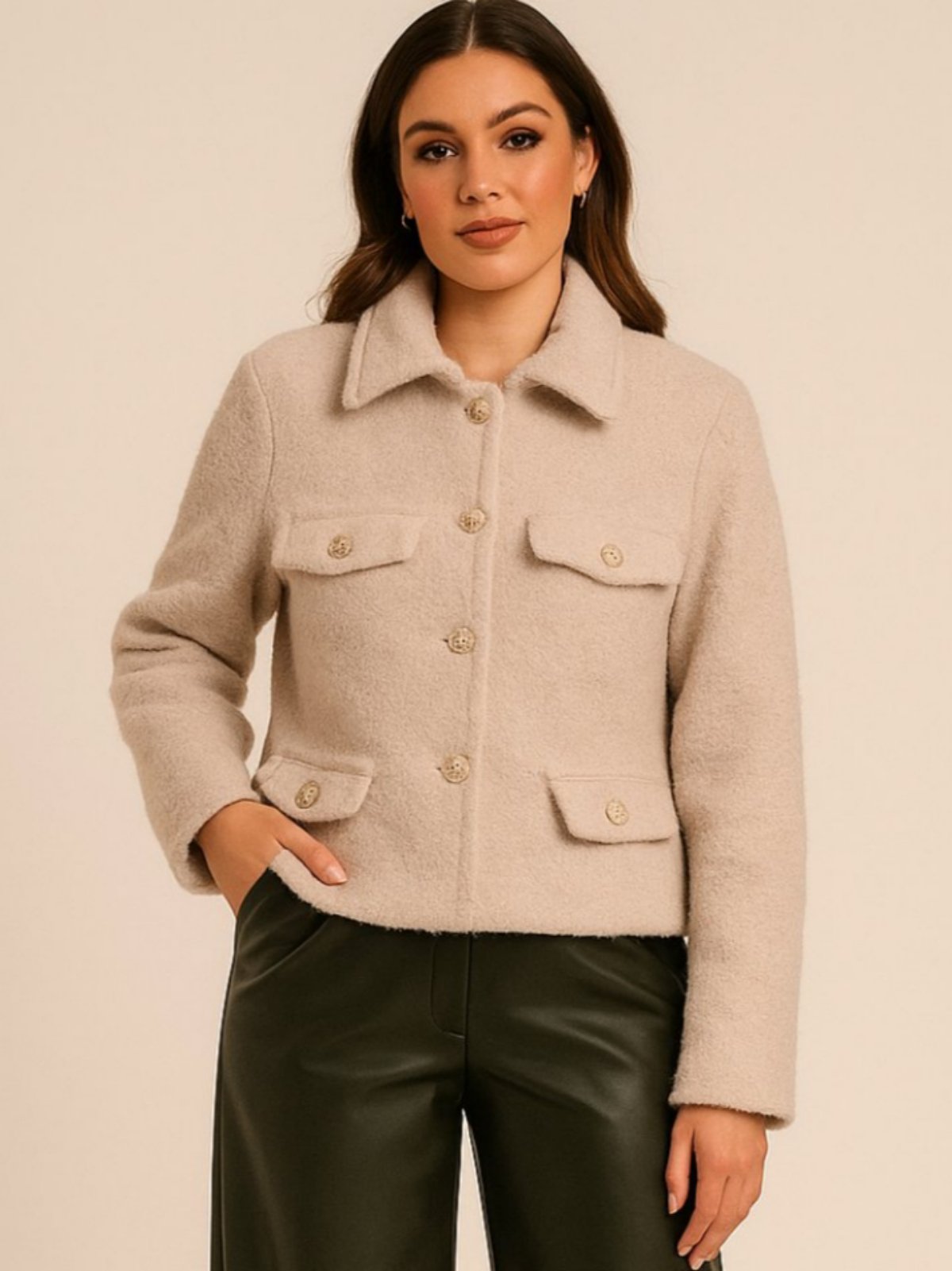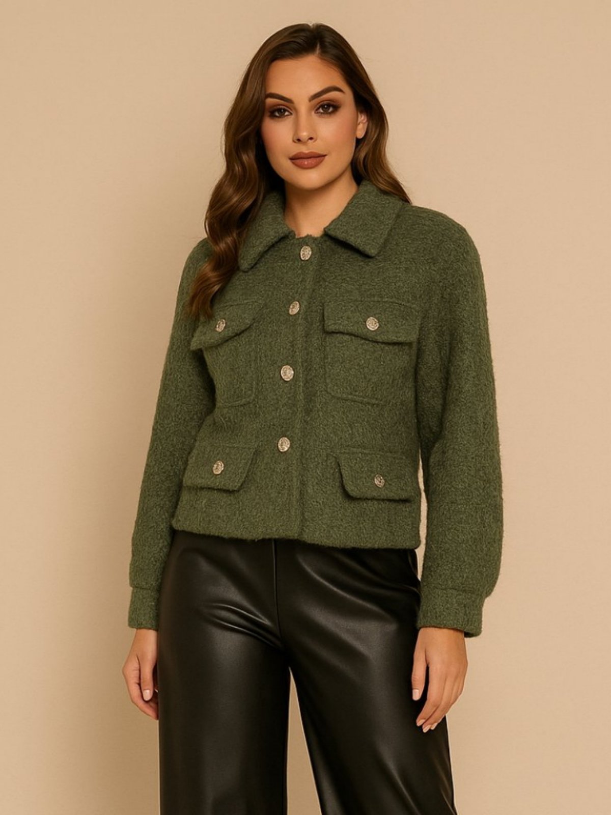 Мека, кратка јакна со предно закопчување со златни копчиња и ревер јака.