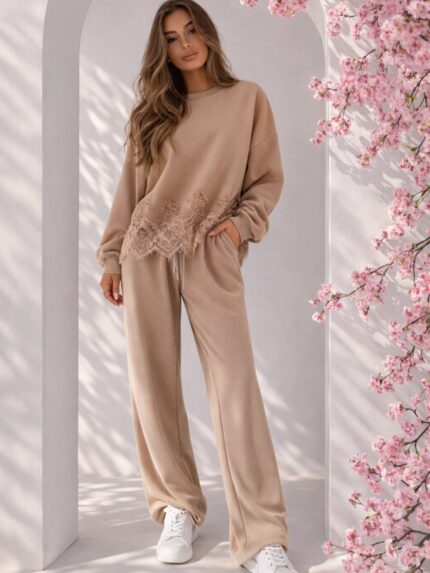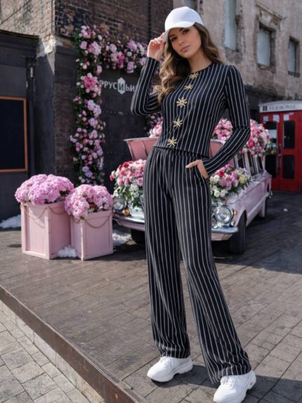 Комплет од ребраст памук со блуза со округлест изрез и долги ракави со странични бели траки и дискретни циркони на белата ткаенина. Панаталони со широки ногавици и висок струк и странични бели траки декорирани со циркони.