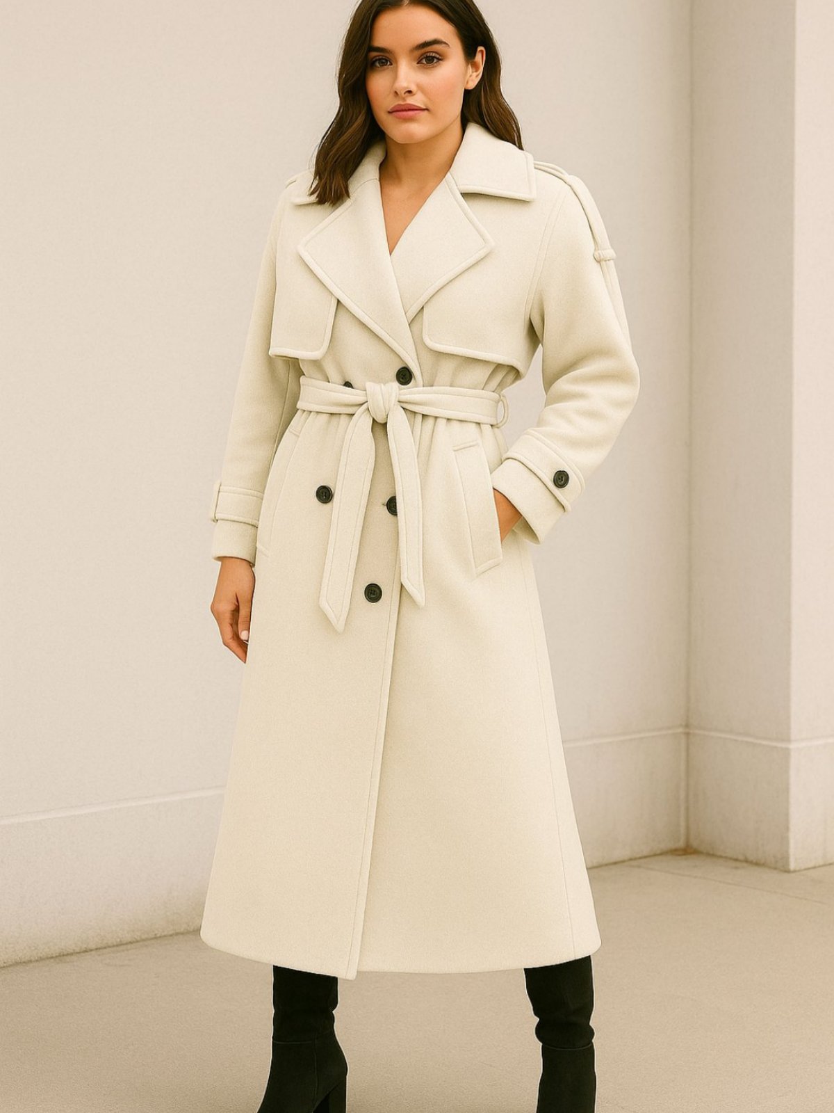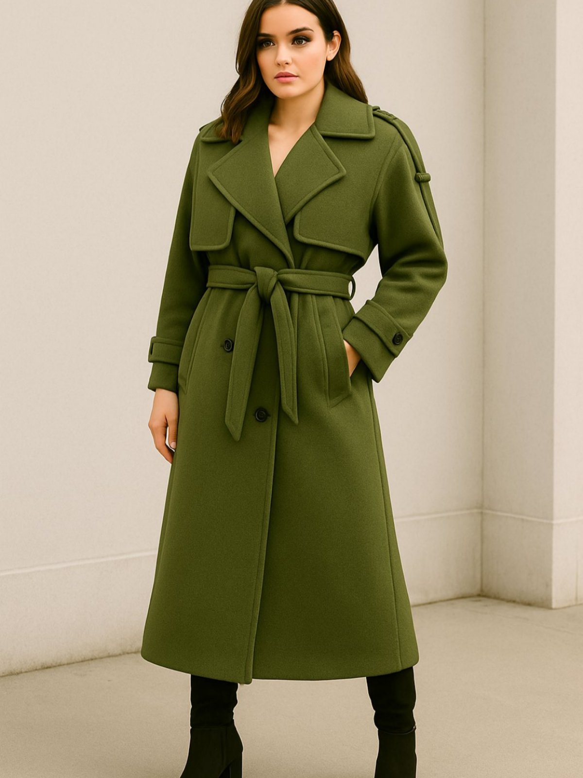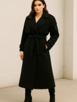 Предимензионален макси капут со ревер јака и предно закопчување со копчиња и колан од истата ткаенина како капутот. Декоративни ремени на рамо и на долниот дел на ракавот.