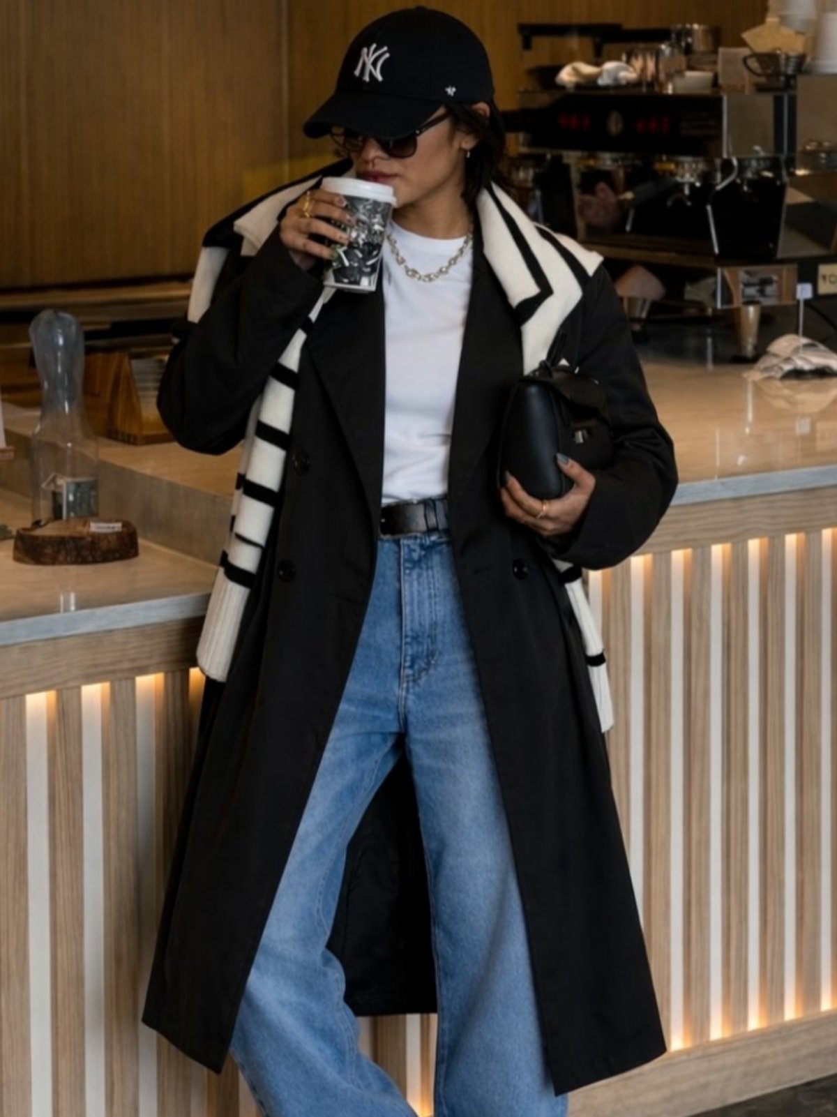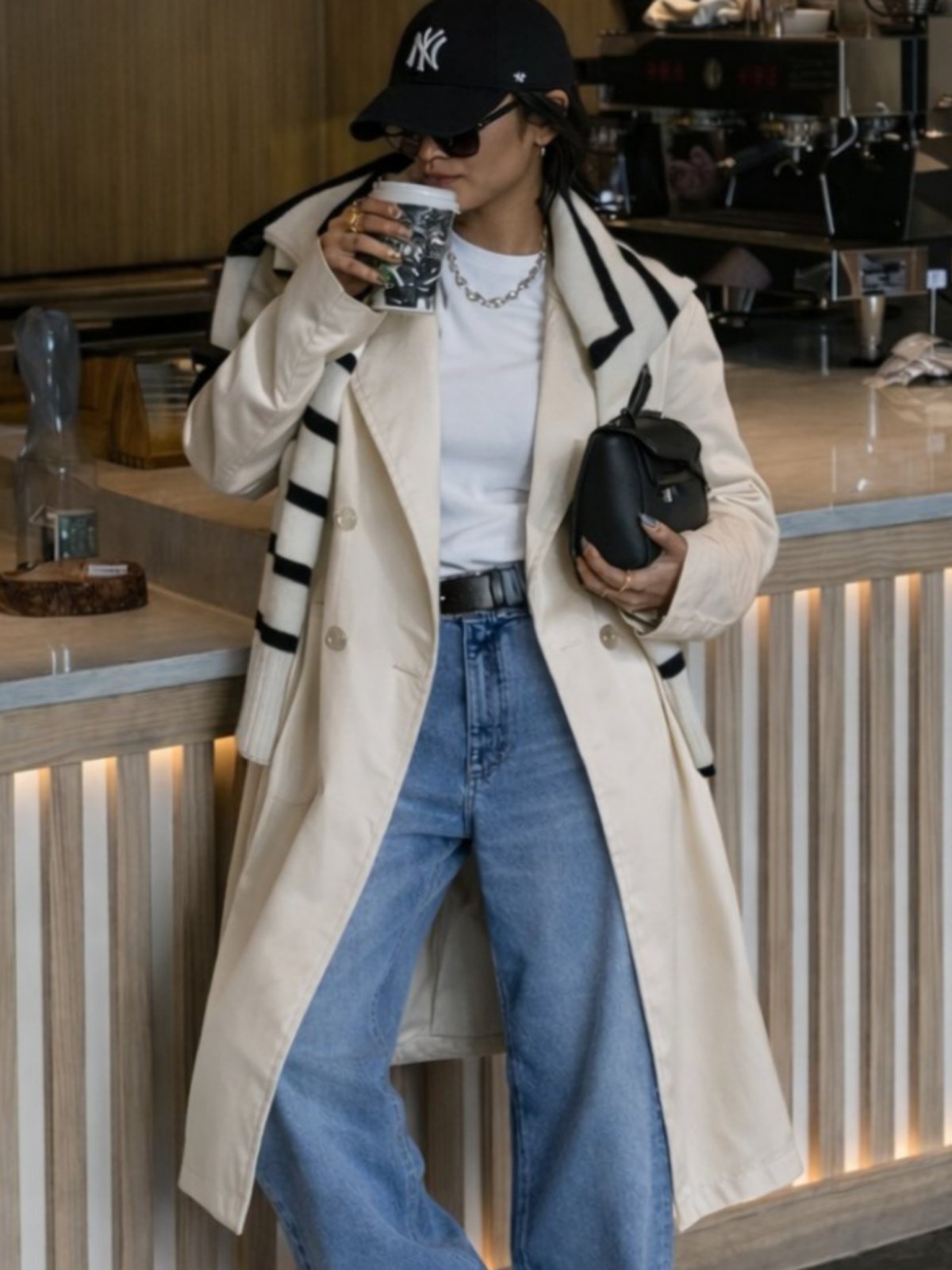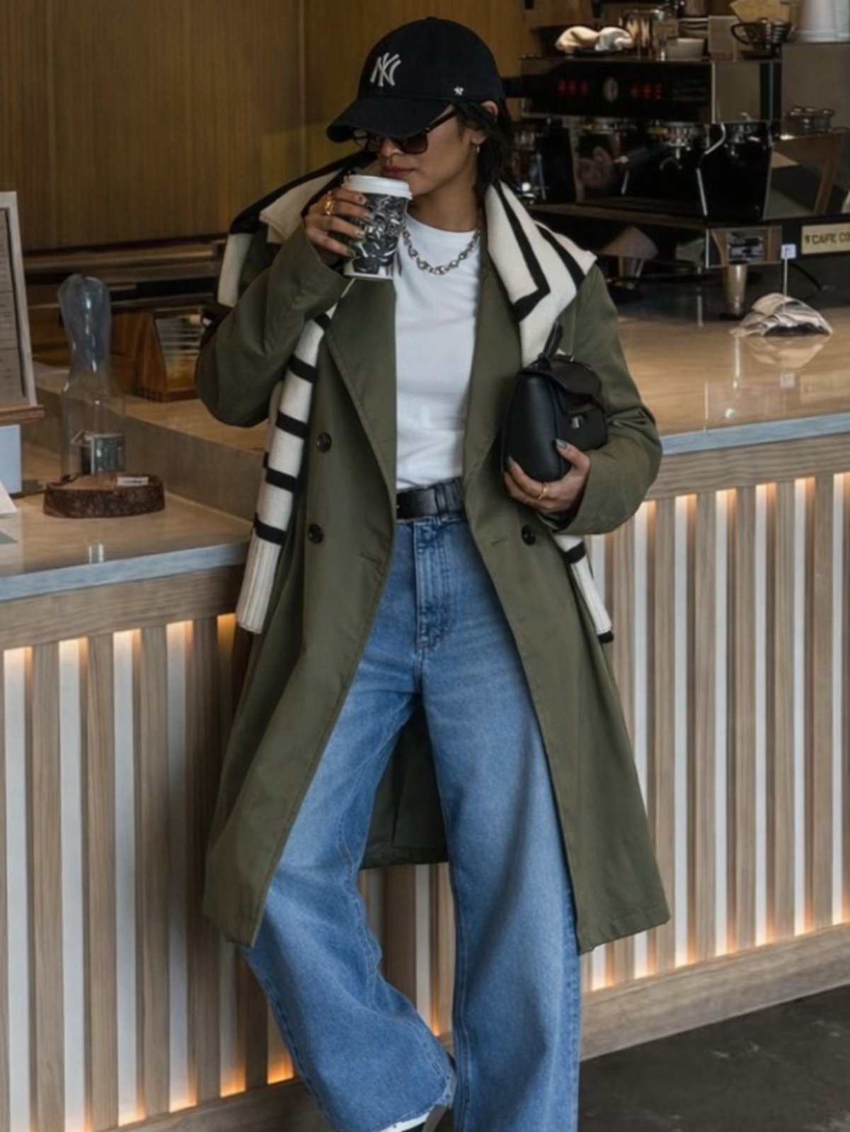 Миди еднобоен тренч со ревер јаки и предно закопчување со копчиња. Колан на ракавите за собриање на истите и колан на половината од иста ткаенина како мантилот. Два странични џебови.