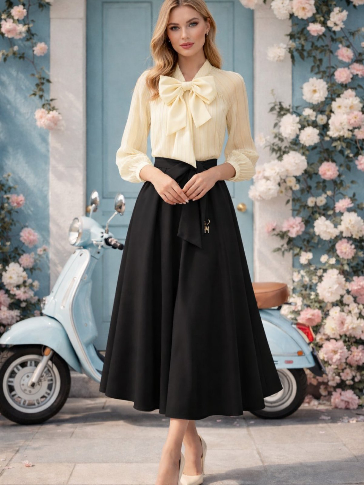 Еднобојна миди сукња од непровидна и тешка ткаенина во А форма со ластик на половина за полесно прилагодување и колан во истата боја и ткаенина како сукњата. Златен брош кој се вади и става заедно со сукњата.