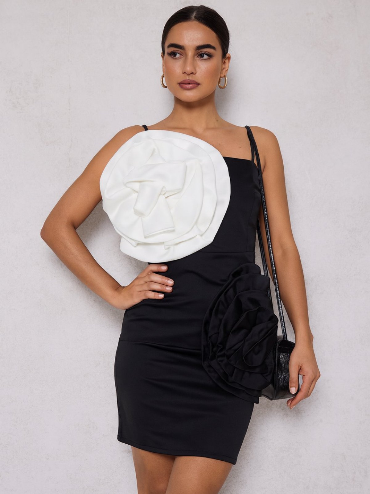 Црн мини фустан од растеглива ткаенина во вид на корсет со тенки прилагодливи рамки и два големи декоративни цветови поставени на предниот дел од фустанот.Закопчување со патент.