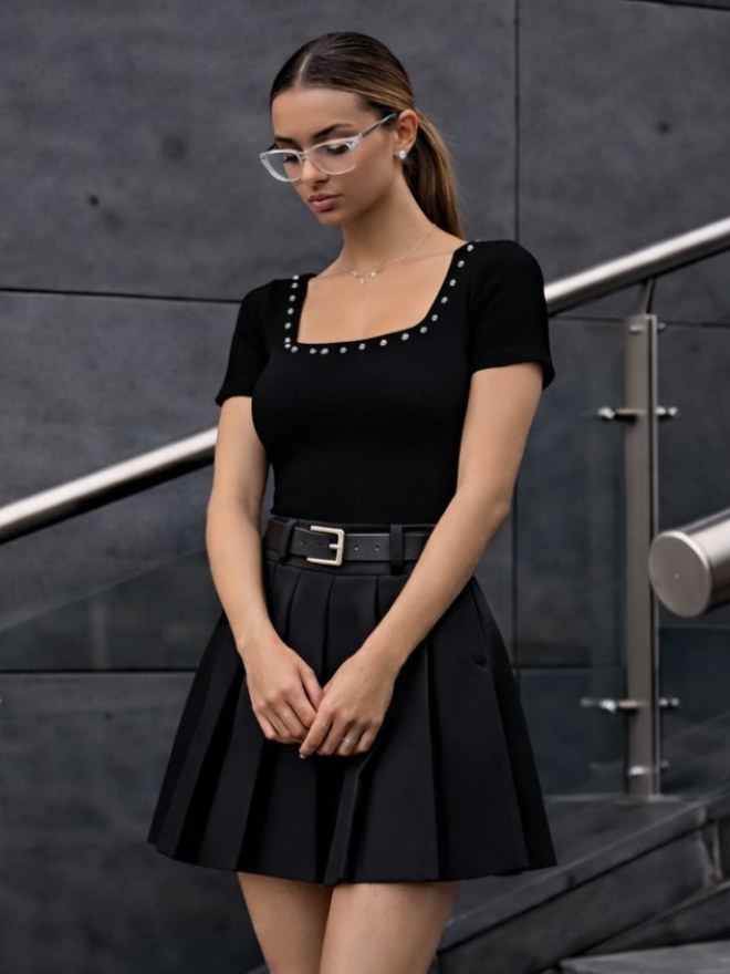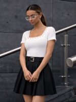 Еднобојна блуза од ребраст памук со кратки ракави и изрез во форма на правоаголник декориран со мали кабзи.
