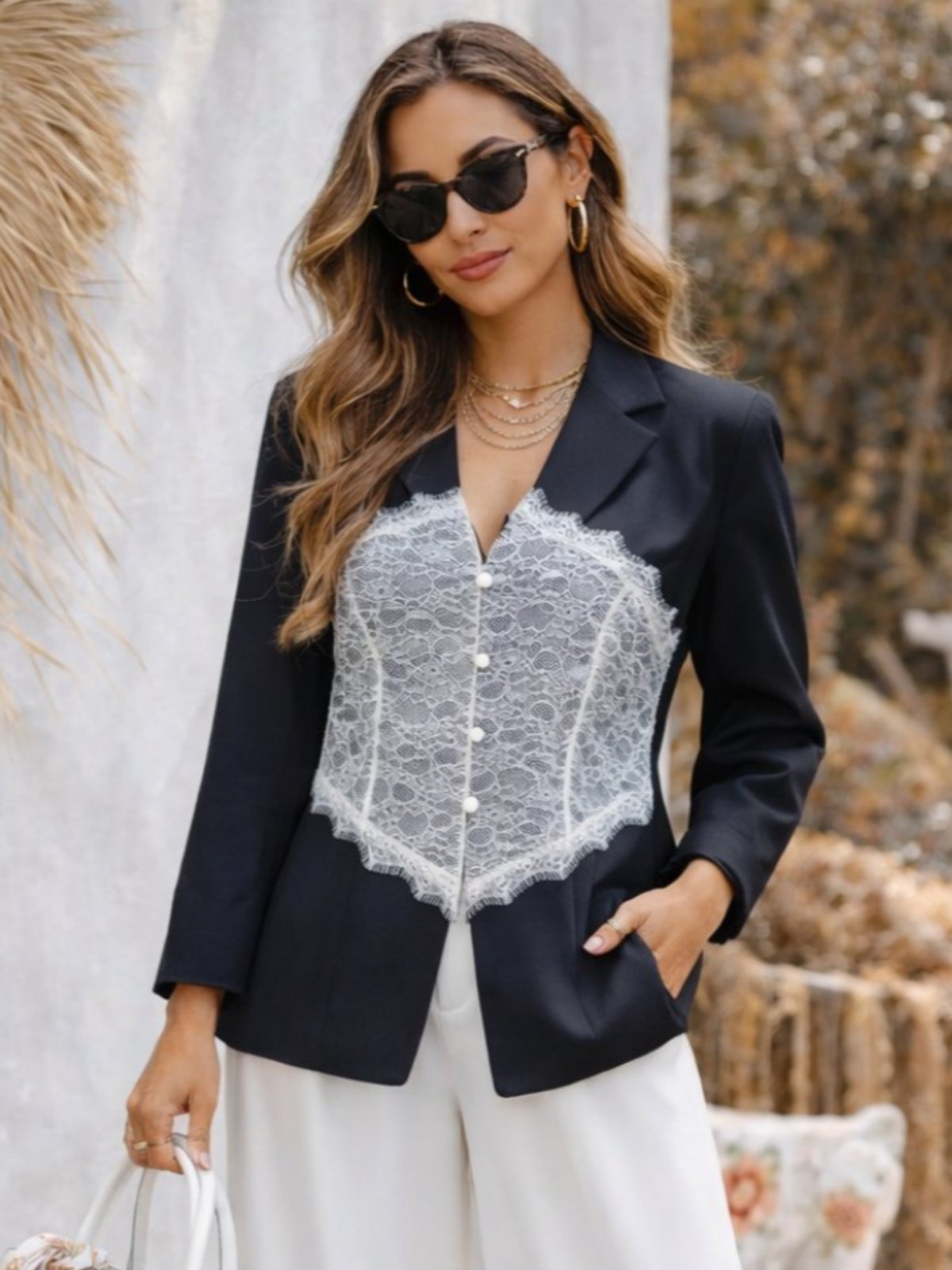 Црно сако, внатрешно поставено со долги ракави и нагласено рамо. Ревер јака и предно закопчување со мали бели копчиња. Нежна тантела во предниот дел која дава изглед на корсет.
