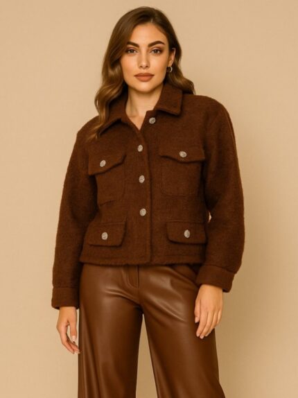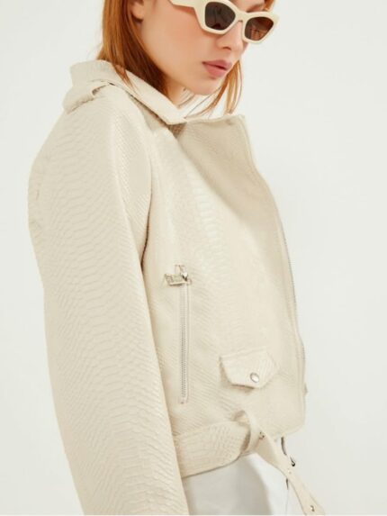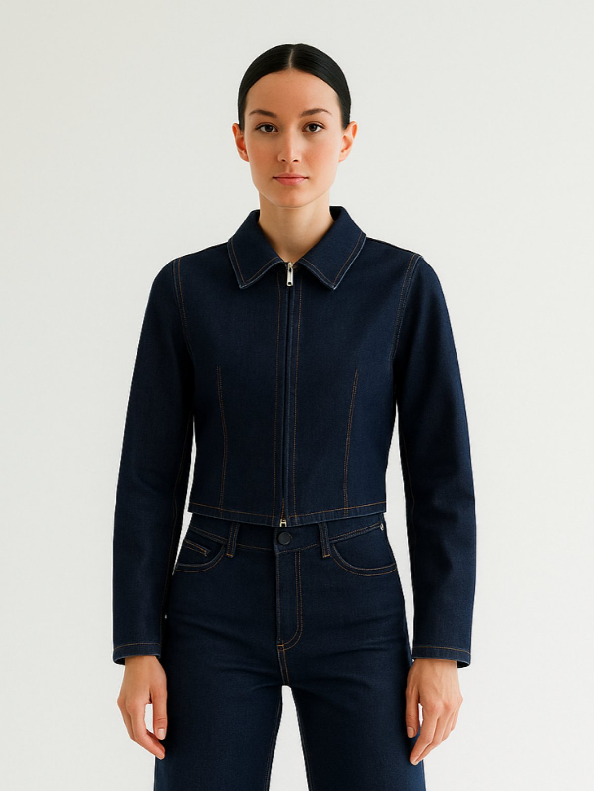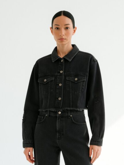Јакна од темен текас со предно закопчување со двонасочен патент. Широки ракави и цепови од страните на ракавите.