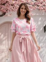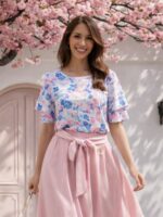 Кошула со краток ракав со дупли фарбели со цветен дезен од пријатен материјал кој не се гужва со округлест изрез.
