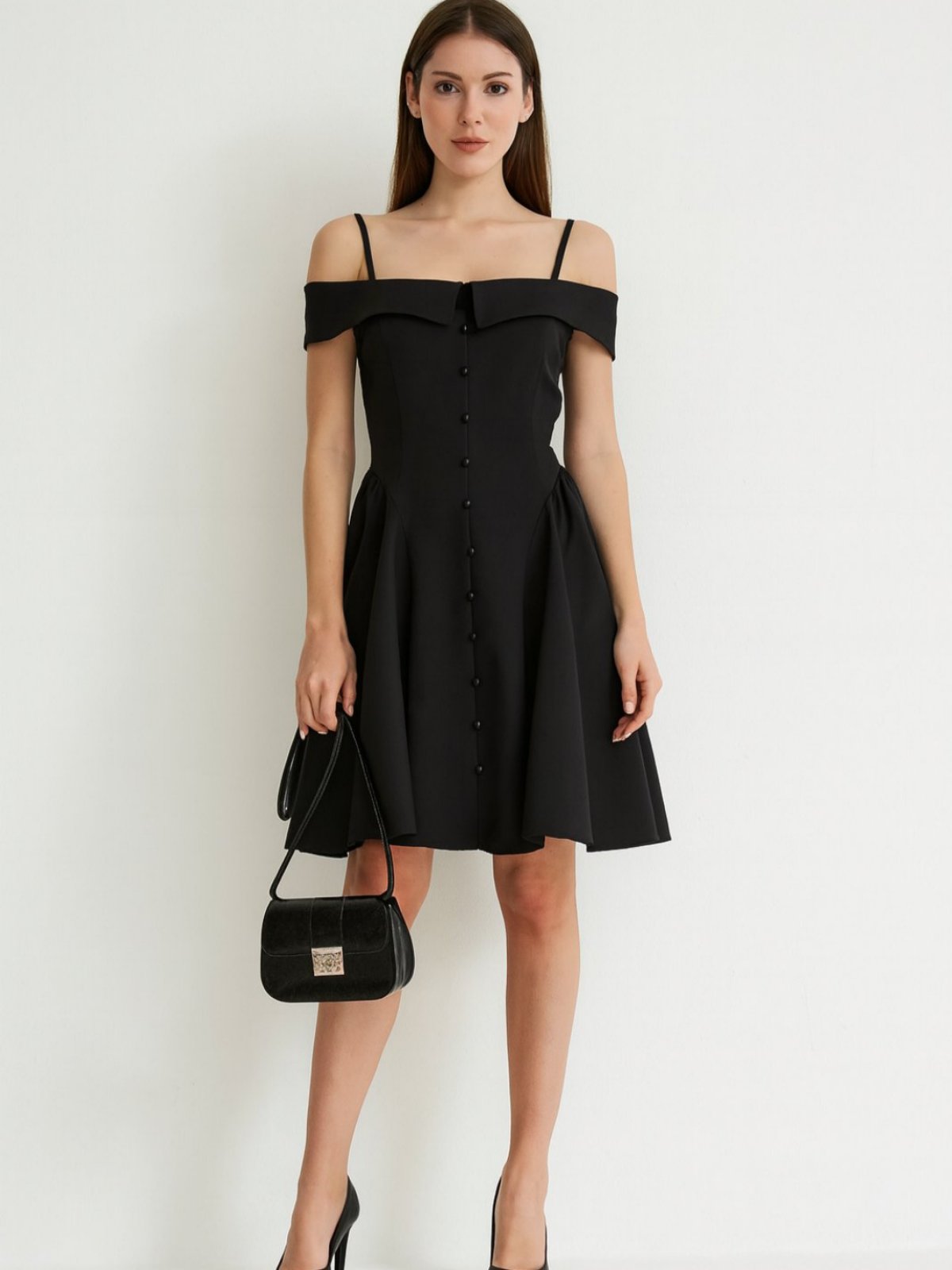 Краток црн фустан со во вид на косет во горниот дел со тенки прилагодливи рамки и паднати мини ракави. Тесен до струкот и потоа надолу раскроен со декоративни копчиња на предниот дел.
