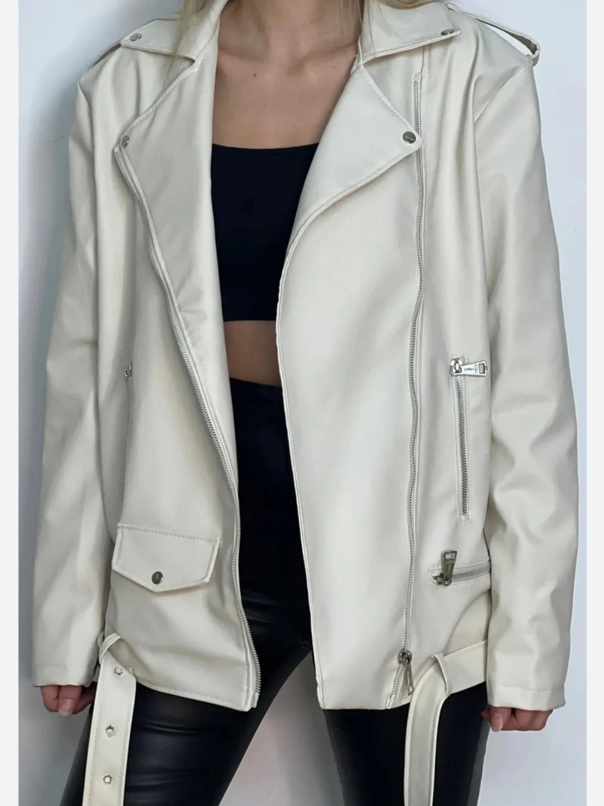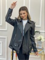 Oversize јакна од вештачка кожа со јака и закопчување на преклоп со метален патент. Внатрешно поставена. Траки на рамената и предни џебови со патенти. Колан од истата ткаенина со метална тока.
